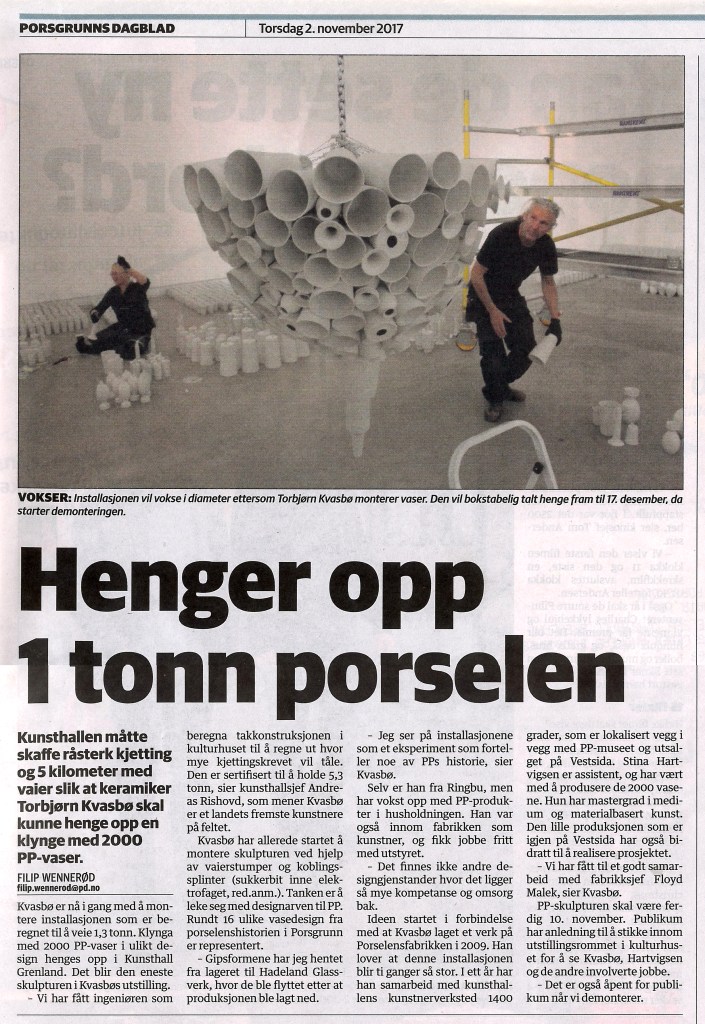 Kunsthall Grenland og Porselensverkstedet 1400 grader har invitert keramiker Torbjørn Kvasbø til å lage et større installasjonsverk. Over 2000 vaser, støpt på gamle vaseformer fra Porsgrunds Porselænsfabrik av kunstner og assistent Stine Hartvigsen, utgjør enkeltelementene som skal bli et spektakulært installasjonsverk.