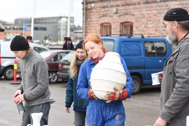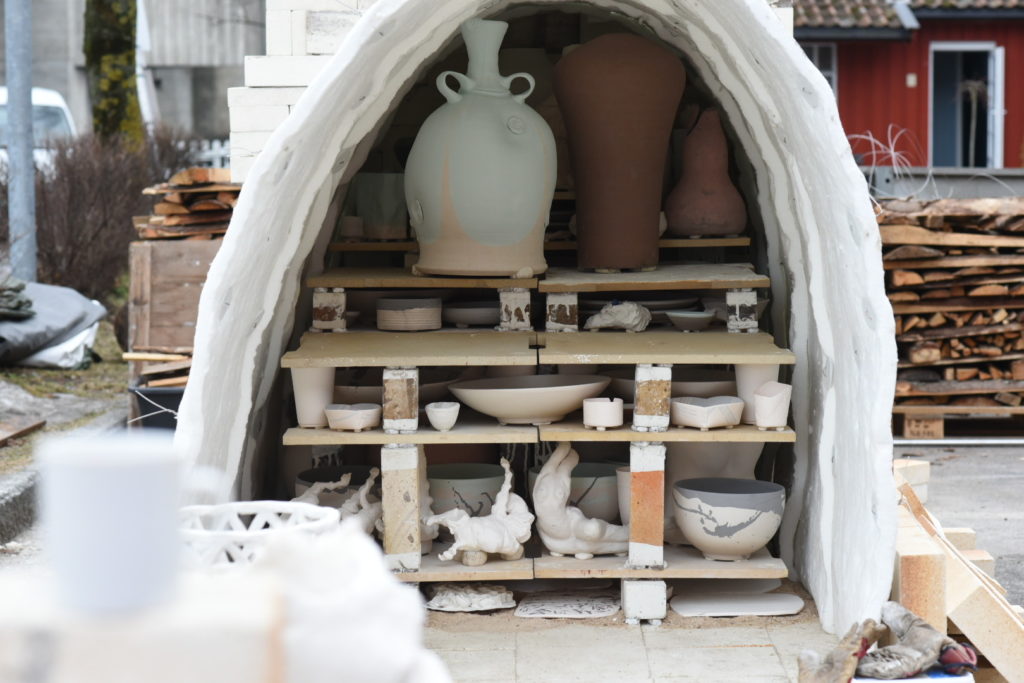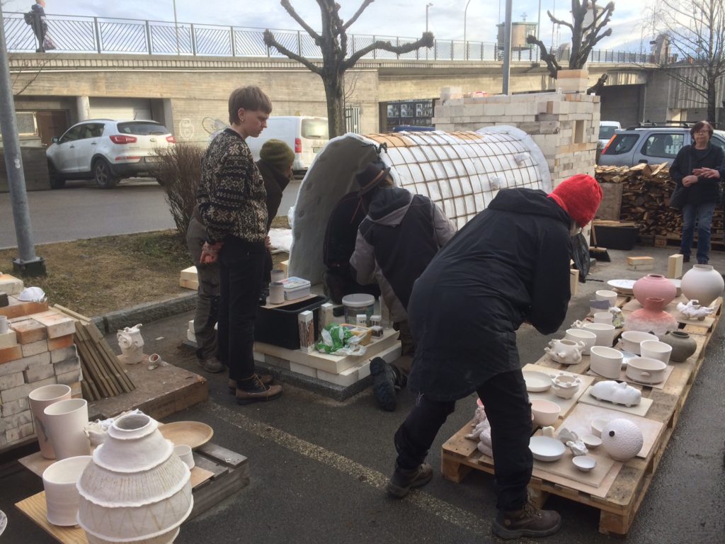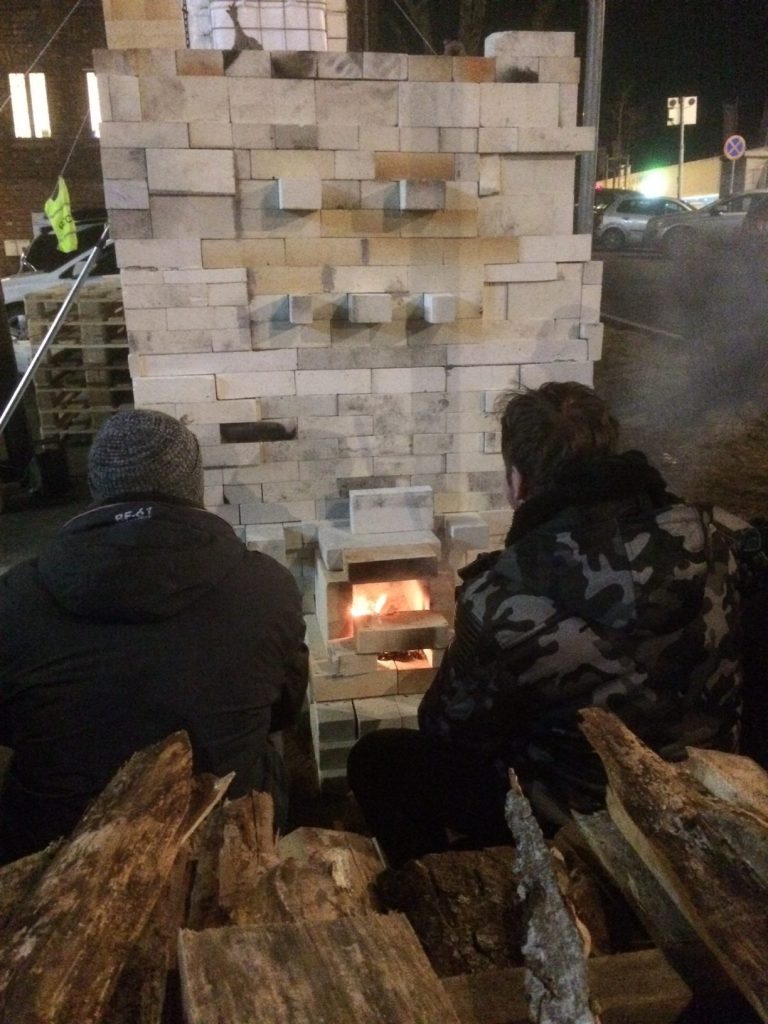 I forbindelse med at porselensprosjektet Vedfyrt II, som går av stabelen denne helgen, ble en store utendørs-ovn fylt med porselen og tent opp i går. Ovnen skal brenne gjennom hele helgen, og åpnes søndag.