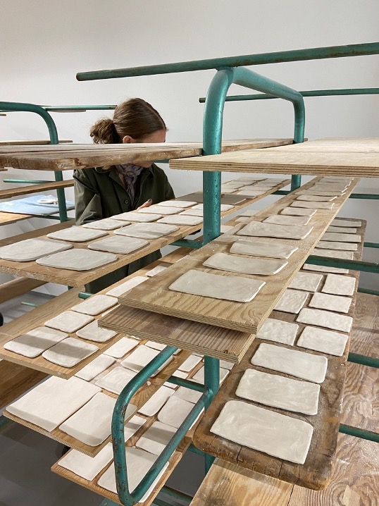 Ettersom det ikke er lagt opp til å jobbe med leire på Spriten, tok Ida tidlig initiativ for å se på muligheten om å inngå samarbeid med verksted 1400° for å jobbe med leira på Porsgrunds Porselænsfabrik. Samarbeid ble det, og Ida arbeider nå i verkstedet 1400°. Hun forteller videre om forskjellen på leira hun har jobbet med tidligere, og leira som finnes på verkstedet.