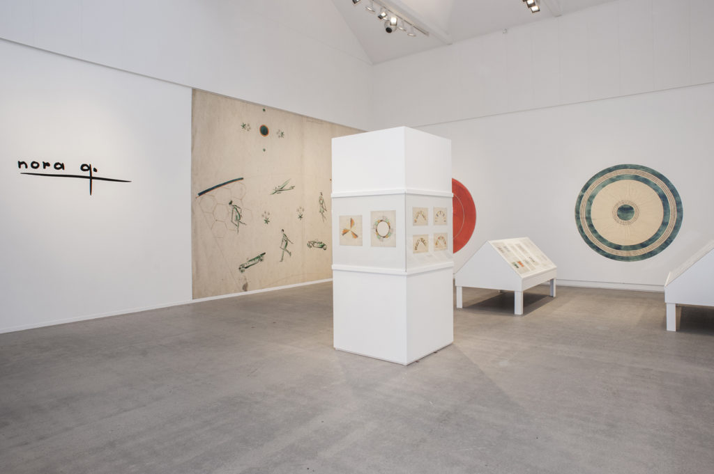 Utstillingen viser skisser og arbeidstegninger, først og fremst valgt etter billedmessige kvaliteter. Kuratorene Kari Skoe Fredriksen og Odd Fredrik Heiberg har funnet frem til og vurdert et stort antall av de over 1800 originalskissene som finnes i PPs samling. Nora G. Var en pådriver for et moderne formspråk på 1930-tallet, de stramme geometriske formene og særegen fargebruk ble hennes signatur. Mange av tegningene er svært gjennomarbeidet og flere av dem innbyr til å betraktes som selvstendige kunstuttrykk.